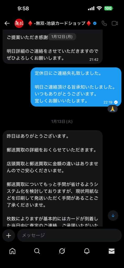 続いて「無双」の郵送買取のやり方はまず無双のXから郵送買取希望の旨のメッセージを送って頂き、店舗側からの返信を待ちます。